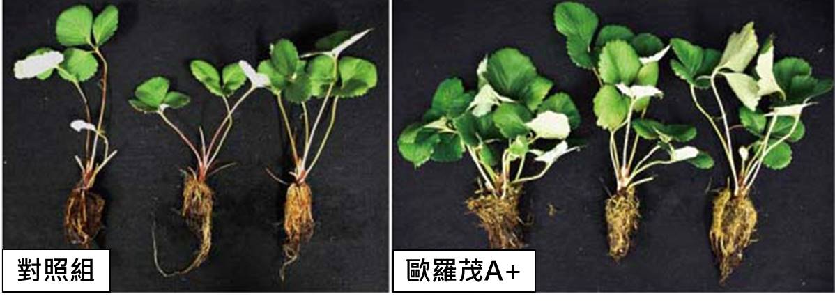 草莓苗每週澆灌稀釋100倍歐羅茂A+液劑,於4週後可促進幼苗地上部及地下部生長。