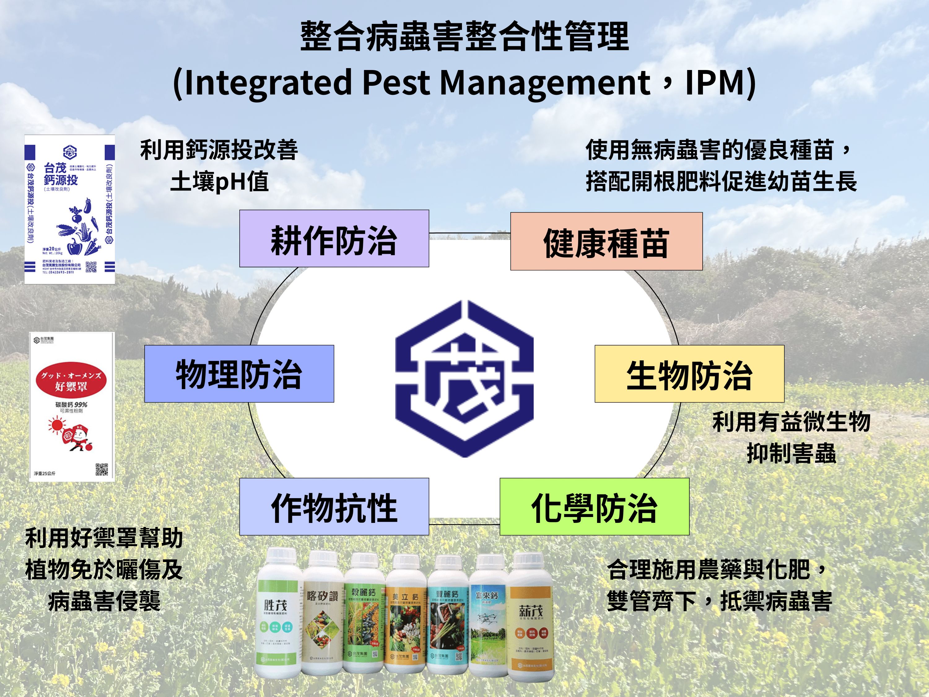 液態肥料種類豐富,包括果樹肥料、糧作肥料、蔬菜肥料、矽肥料、空噴機肥料和有機質肥料。此外,另有多項免登記的植物保護資材,響應農業部「農藥十年減半」政策,推動作物害物綜合管理(IPM),提供農民更多綠色選擇。台茂與學研機構合作,技術轉移與研究,成功開發對環境、土壤及植物健康有益的微生物肥料,進一步推動永續農業發展。